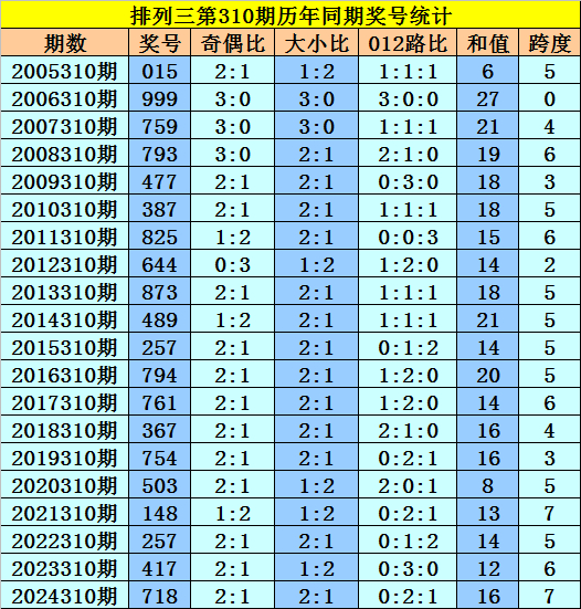 开奖回顾:排列三第2025309期开出奖号527,奖号012路比为0:1:2,大小比为2:1,奇偶比为2:1,最近三年第310期同期开出奖号为:第2022310期:257、第2023310期:417、第2024310期:718。