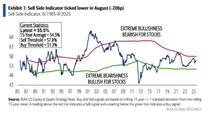 最新数据显示,8 月这个指标从 55.7% 降到了 55.5%—— 这是 4 月以来第一次下降,但降幅很小(才 0.2 个百分点)。目前指标还在 “中性” 区间,但离 “卖出” 信号(57.8%)比 “买入” 信号(51.3%)更近。不过别慌,美银强调:就算现在指标高于 15 年平均,未来 12 个月标普 500 仍有望涨 13%。