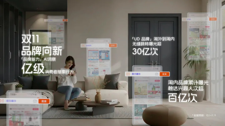 数据显示,双11期间,通过UD实现的从淘外到淘内的无缝跳转曝光超30亿次,其在效果核心媒体的投放ROI达到10以上。淘内品牌累计曝光触达兴趣人次超百亿次,淘外种草淘内追击率甚至高达70%。