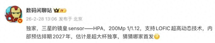 今天,博主@数码闲聊站 的一份爆料中提到,三星的镜皇sensor——HPA,200Mp 1/1.12,支持LOFIC超高动态技术,内部预估排期2027年,估计是超大杯独享。