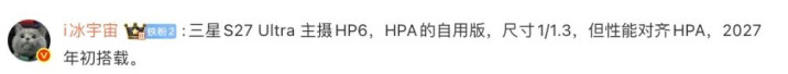 与此同时,博主@i冰宇宙 也在互动中提到“三星S27 Ultra 主摄HP6,HPA的自用版,尺寸1/1.3,但性能对齐HPA,2027年初搭载。”
